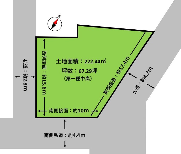 | 道路状況 | 三方 東側:幅員4.2m 公道に17.4m接面 西側:幅員2.8m 私道に15.86m接面 南側:幅員4.4m 私道に10m接面 | ||